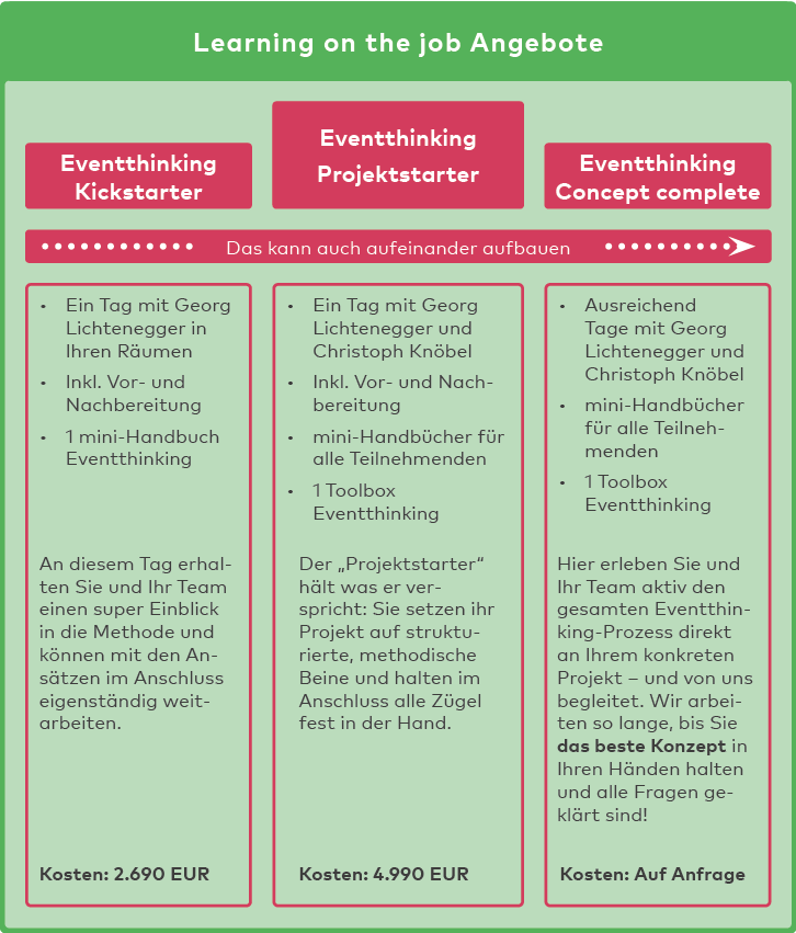 Zum einen lernen Sie und Ihr Team Eventthinking intensiv kennen. Zum anderen wird ihr Schreibtisch leerer, da Sie mit Ihrem aktuellen Projekt vorankommen. Eine wahre Win-Win-Situation für Sie, weil Sie Eventthinking am besten an einer konkreten Veranstaltung lernen!